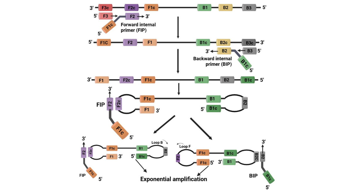Figure 1: Schematic outline of loop-mediated isothermal amplification (LAMP). LAMP uses two sets of primers targeting six distinct regions of the DNA. The inner primers, containing both sense and antisense sequences, initiate DNA synthesis by hybridizing the target. The outer primers then perform stranddisplacement synthesis, generating single-stranded DNA templates for the second set of primers. This forms a looped DNA structure. The inner primers bind to the loop, initiating synthesis of new strand [34].