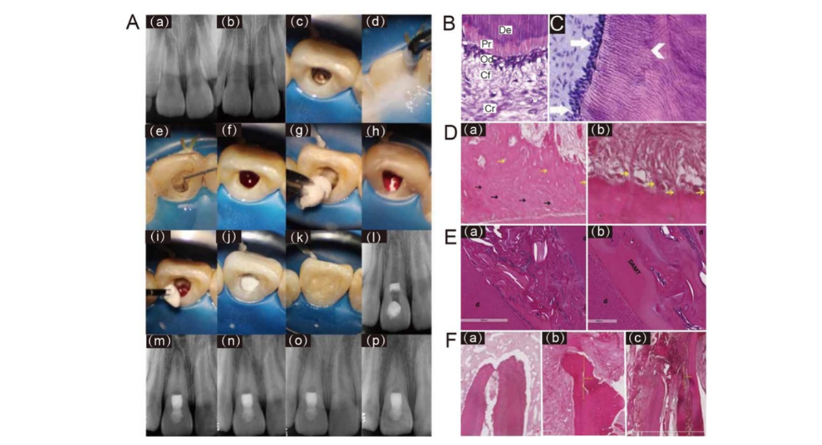(A) REPs performed with a pure collagen scaffold for an immature tooth 8 with intrusive luxation and diagnosed as symptomatic apical periodontitis approximately 4 months after injury. The tooth showed continued root canal space narrowing 48 months after treatment. (a-b) Periapical radiographs of tooth 8 after injury and 4-month post-injury. (c–e) Clinical image of tooth 8 involved access opening, irrigation, and medication of the root canal. (f) Clinical image of inducing apical bleeding into the canal space. (g–h) Clinical image of placing a piece of resorbable collagen sponge over the blood clot. (i–j) Clinical image of incrementally placing a 3- mm thick layer of bioceramic paste over the collagen sponge. (k) Clinical image of filling the access cavity with resin composite. (l-p) Periapical radiographs of tooth 8 after treatment, 6-month, 12- month, 24-month and 48-month follow-up. Reprinted with permission from Ref [4] (B) HE staining of the dentin-pulp interface in a healthy tooth. Dentin (De) with tubules running parallel to each other; predentin (Pr) with uniform thickness; palisading odontoblast layer (Od); cell-free zone (Cf); cell-rich zone (Cr) (original magnification x400). Reprinted with permission from Ref [68] (C) Reparative dentin. Mature, secretory odontoblasts lining newly formed tubular dentin (arrows). Reprinted with permission from Ref [49] (D) Cementum-like tissue. (a) deep layer of acellular cementum-like tissue (black arrows) covered by cellular cementum-like tissue (yellow arrows). (b) Sharpey’sfibres-like projections inserted into a cementum-like layer (yellow arrows). Reprinted with permission from Ref [61]. (E) bone-like tissue. (a) The newly formed intracanal mineralized tissue that is transitioning toward full calcification is intermixed with scaffold particles and connective tissue. (b) The areas of solidification between dentinal walls, DAMT, and the newlyformed intracanal mineralized tissue with calciotraumatic lines in between. Reprinted with permission from Ref [51] (F) periapical hard tissue. (a-b) The apical foramen was sealed by cementum-like tissue; (c) the apical foramen was closed by bone-like tissue. Reprinted with permission from Ref [61].