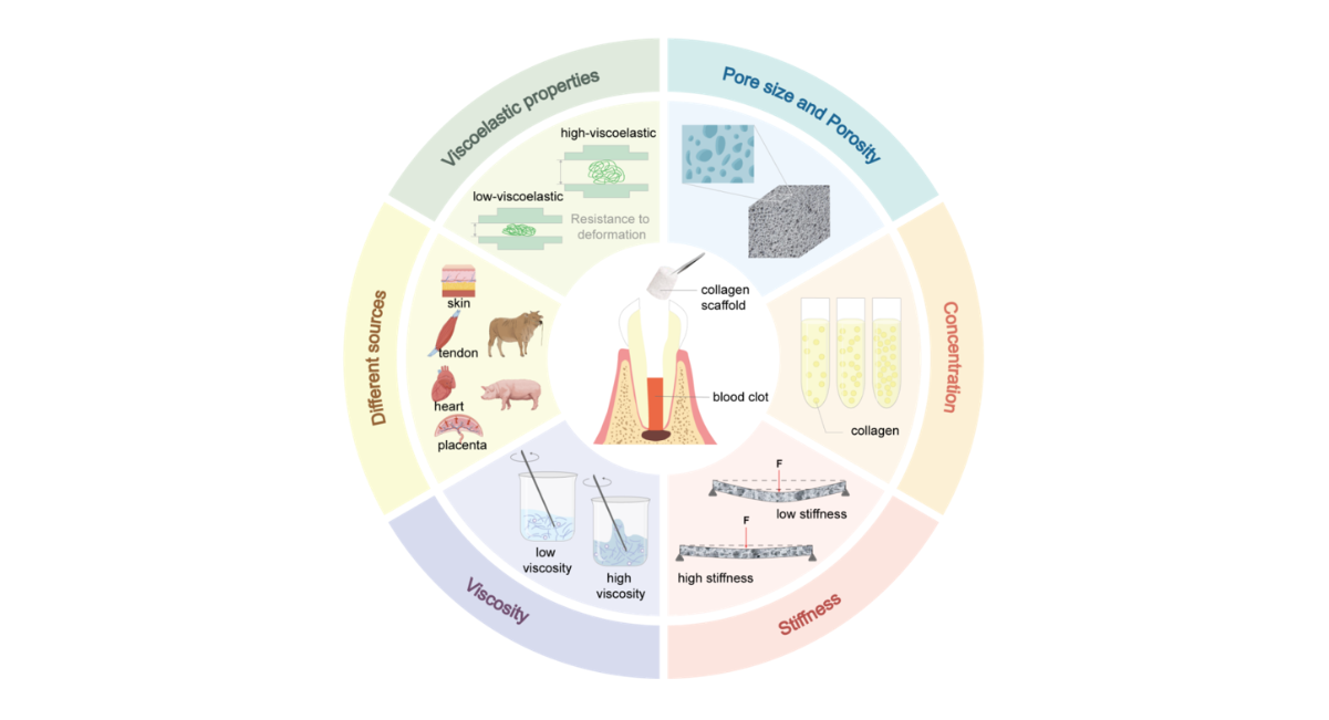 Figure 2: Schematic diagram illustrating the physicochemical properties (e.g., pore size and porosity, concentration, stiffness, viscosity and different sources) of collagen scaffolds influencing the regeneration of the pulp-dentin complex.
